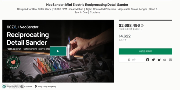 在工具类众筹领域,垂直细分策略往往比全面布局更易突围。HOZO Design推出的NeoSander首次将往复式线性电机应用于电动打磨,精准解决精细打磨场景的痛点。项目于2026年1月20日上线,50天内筹得268.8万美元,吸引1.46万名支持者,成为电动打磨细分领域的爆款。