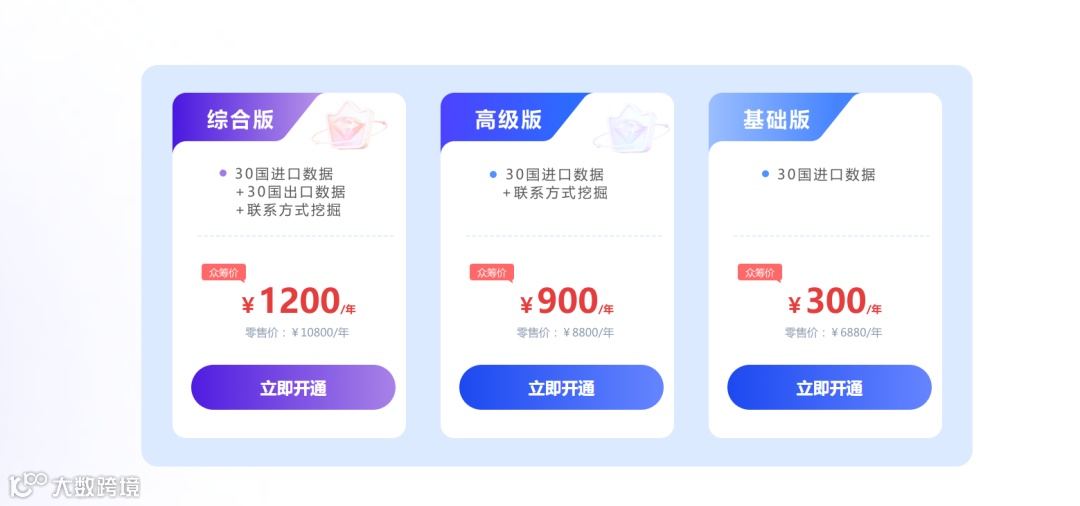 基础版 300元/年:涵盖30国开发、提单查询、客户背调及同行分析,全年数据实时更新。