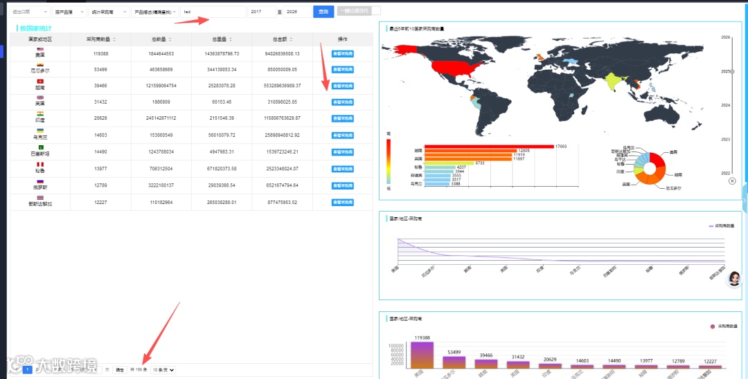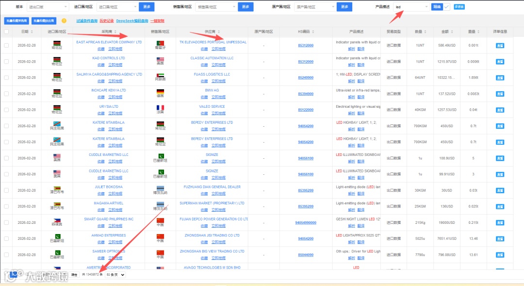 输入产品关键词与销售国,精准定位目标市场采购商交易记录。例如,以“LED”为例设定销售国为中国,即可获取专属中国贸易伙伴的客户详情。