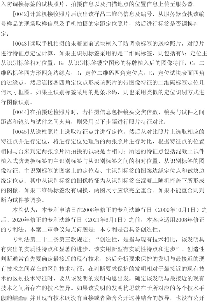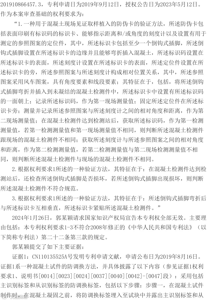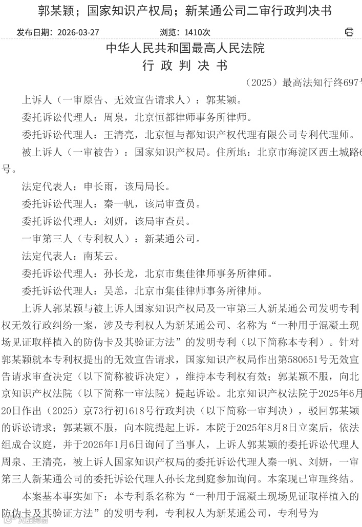 2026年3月24日,最高人民法院对"一种用于混凝土现场见证取样植入的防伪卡及其验证方法"发明专利权无效行政纠纷案作出终审判决,认定现有证据不足以证明专利不具备创造性,维持国家知识产权局专利权有效决定。