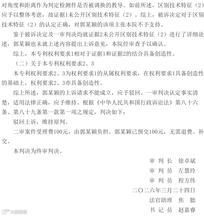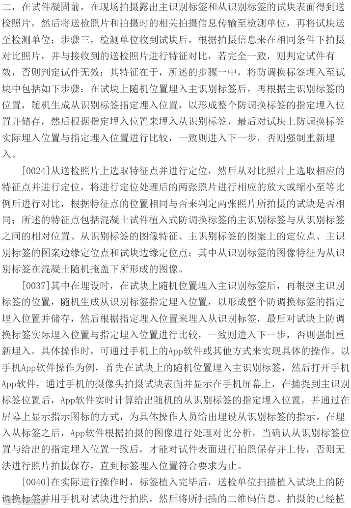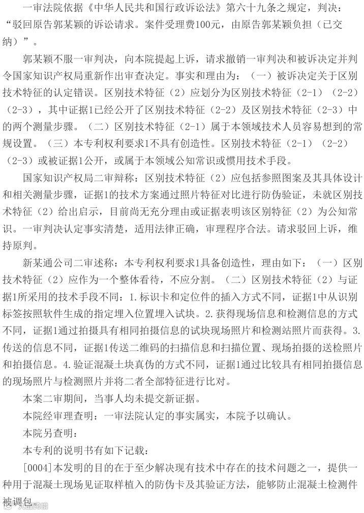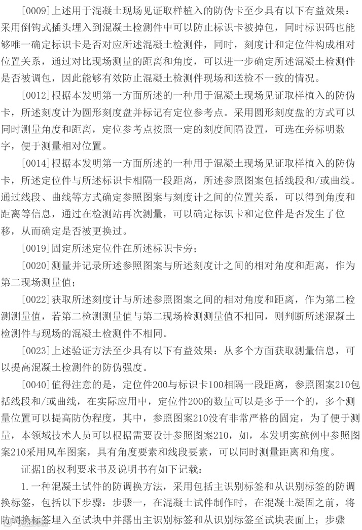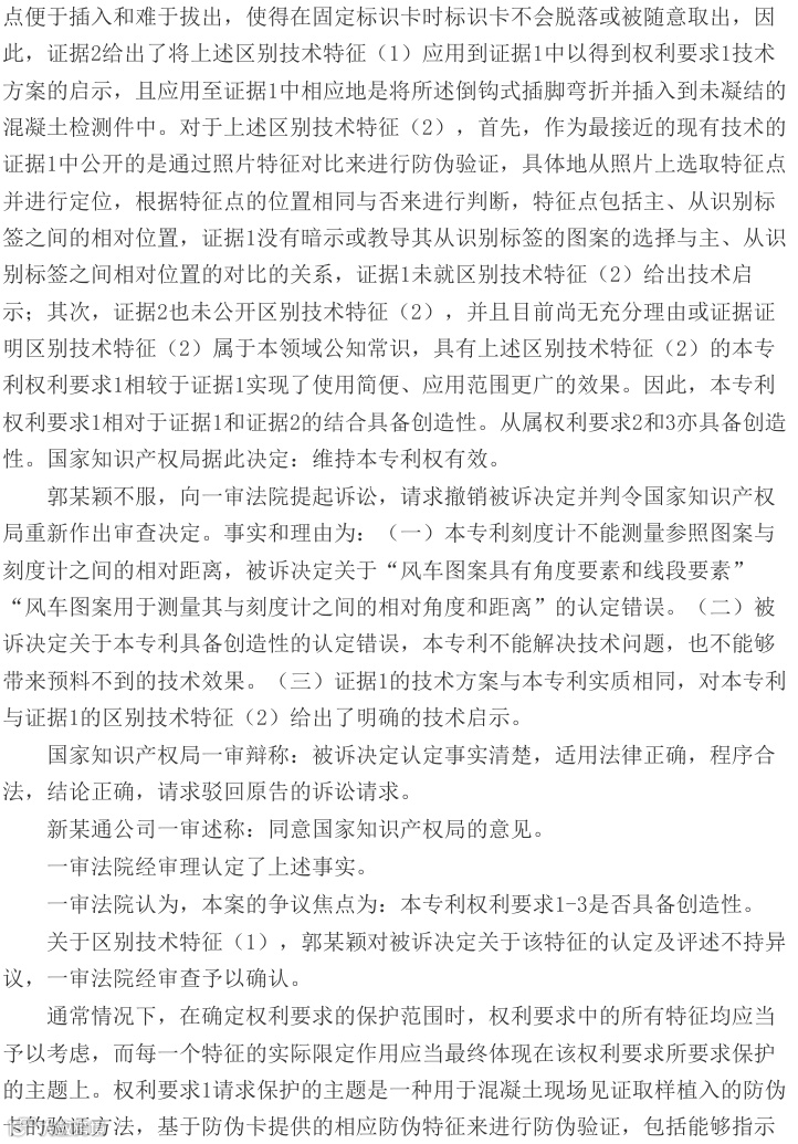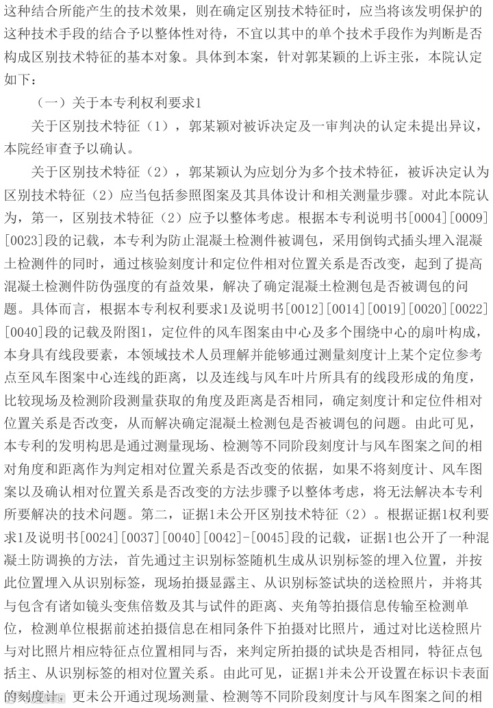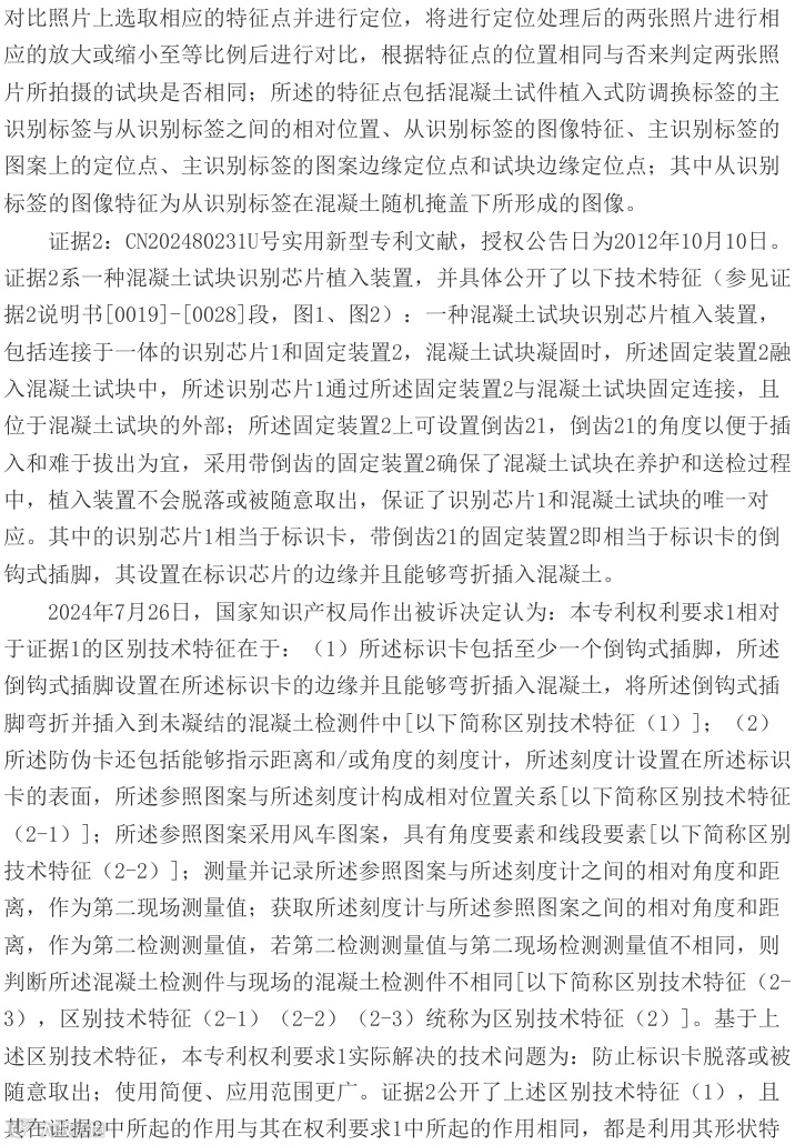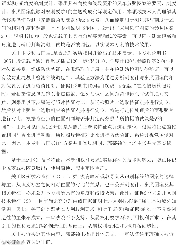 法院指出,本专利权利要求1的核心区别技术特征——刻度计与风车图案的相对位置关系测量方式未被现有技术公开。证据1虽涉及混凝土试块防调换方法,但未披露角度和距离验证技术;证据2亦未公开相关特征。该专利通过多重防伪特征结合,有效实现混凝土检测件防调包的技术效果。