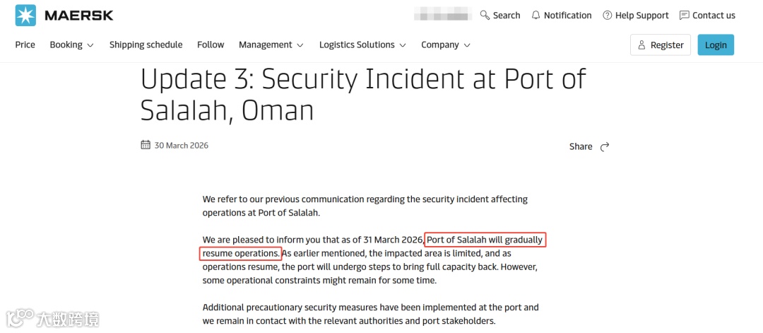 马士基宣布塞拉莱港将于2026年3月31日起逐步恢复运营
