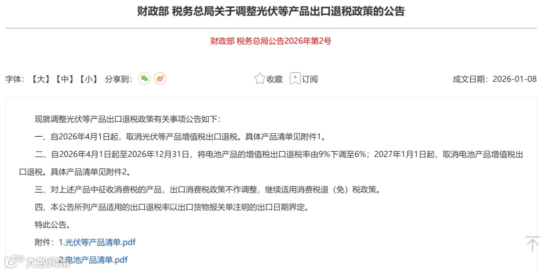 二、电池产品实施阶梯式调整:2026年4月1日至12月31日,出口退税率由9%下调至6%;2027年1月1日起,全面取消出口退税。