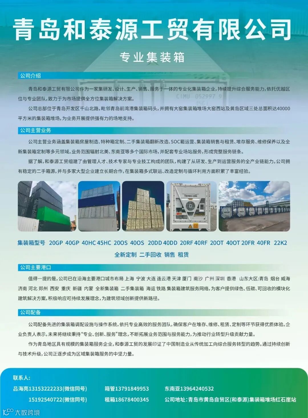 业务覆盖青岛、天津、上海、宁波、连云港、郑州、西安、广州等国内主要港口城市,并延伸至东南亚、中亚及北美国际市场,提供集装箱租赁、回收及全新集装箱定制服务。