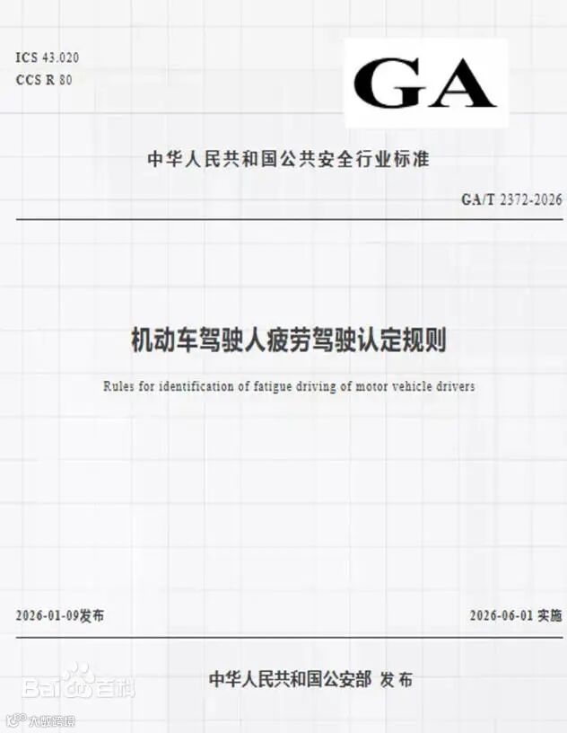 公安部《机动车驾驶人疲劳驾驶认定规则》(GA/T 2372-2026)将于2026年6月1日实施。新规突破"仅看驾驶时长"的旧模式,建立驾驶行为、生理状态与作息背景的三维认定体系,例如闭眼持续≥2秒即可判定疲劳驾驶。