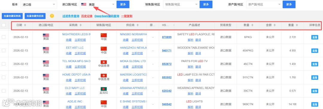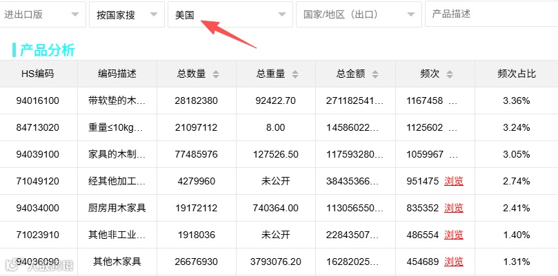 输入目标国家即可获取畅销产品清单,包含HS编码、产品描述、采购金额、重量及数量等核心指标,为新品开发提供数据支撑。