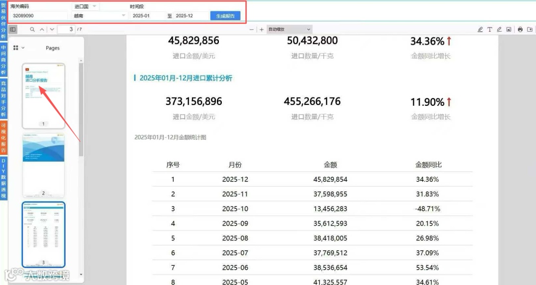 分析目标市场实时需求、价格波动及政策风险,生成可视化报告。数据趋势分析功能支持PDF导出,适用于市场分析、客户背调和商务汇报。