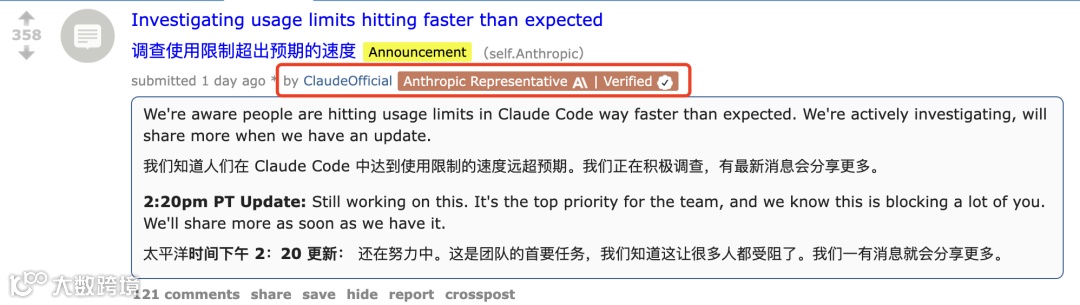 Claude Code计费异常问题已引发广泛用户投诉,Anthropic公司正式回应称:"已发现用户触发使用上限速度远超预期,团队正优先排查并及时同步进展。"