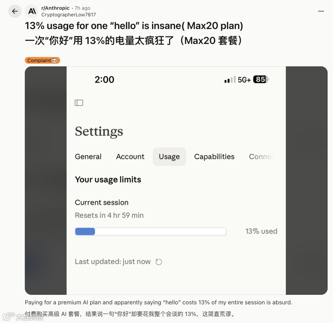 此前用户实测数据显示异常消耗现象:发送"你好"消耗13%额度,工作11分钟耗用23%额度,部分提示词甚至单次占用31%额度。即便200美元/月的高端套餐,3.5小时即达使用上限。