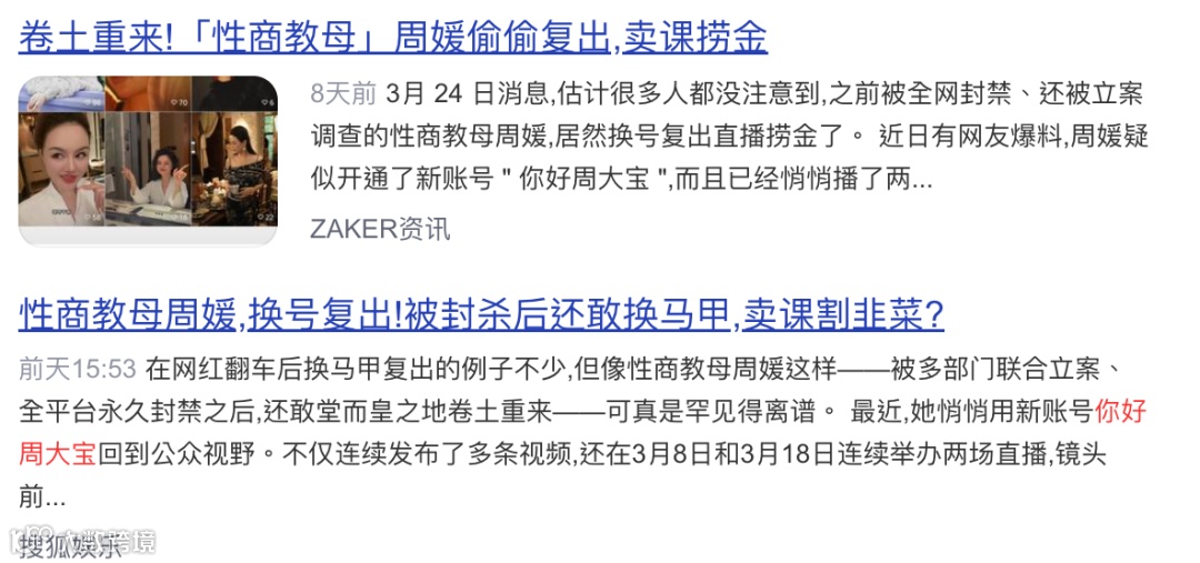 今年1月,周媛因开办"魅力女性修炼班"售卖999-88000元课程,被质疑宣扬讨好男性遭封禁。仅两月后,其通过新账号"你好周大宝"于3月8日、18日开启直播,并持续更新内容。