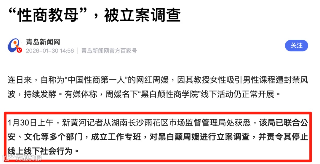 争议核心不仅是内容擦边,更在于课程以"女性成长"为名,实际引导女性角色工具化。1月30日,雨花区市监局联合多部门成立专班,责令其停止全部经营活动。
