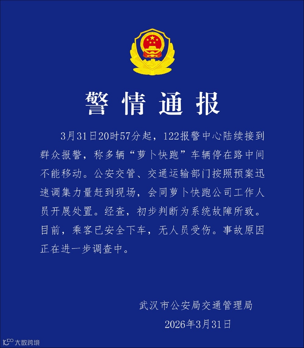 武汉市公安局交通管理局通报,3月31日晚,武汉部分区域多辆“萝卜快跑”车辆在路中间停止运行。经交管、交通部门与萝卜快跑公司联合处置,乘客均安全下车,无人员伤亡,具体原因仍在调查中。