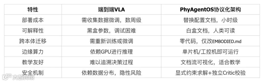 传统VLA模型将感知、推理、控制压缩为单一神经网络,存在不可解释、迁移难等问题。PhyAgentOS通过六层结构化协议实现系统革新:
