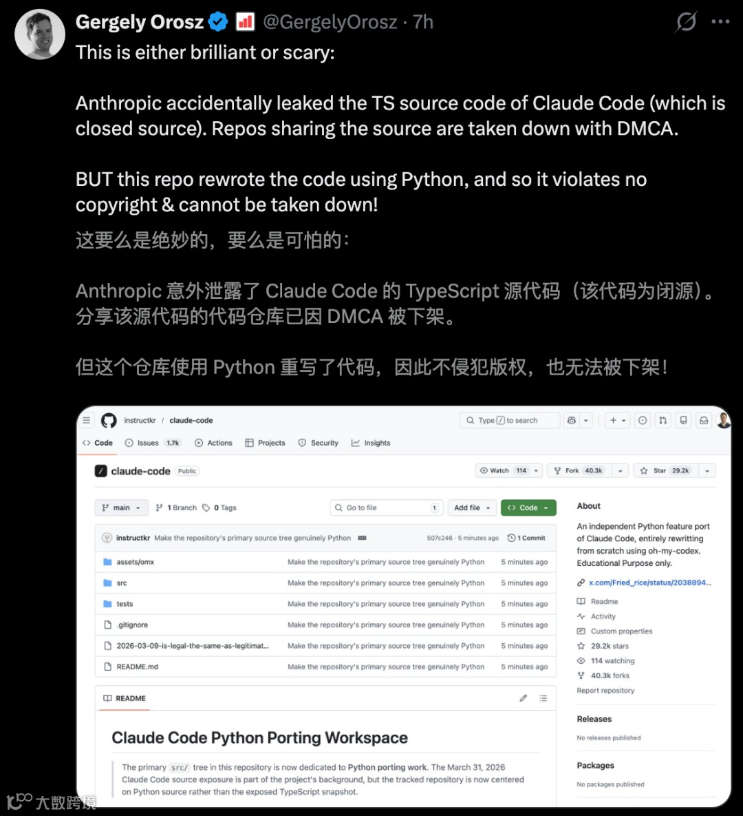 【新智元导读】Claude Code源码库引发技术圈震动,60k人深夜Fork。Anthropic紧急启动DMCA维权,原作者凌晨4点完成Python、Rust双重构。