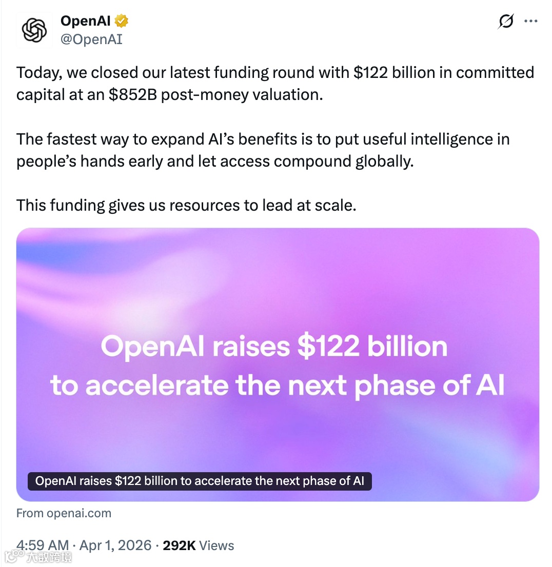 智东西4月1日消息,OpenAI宣布完成最新一轮融资,募集资金达1220亿美元,投后估值8520亿美元,创全球单笔私募股权融资规模纪录。该估值接近腾讯(4.42万亿港元)与阿里(2.27万亿港元)港股市值总和。