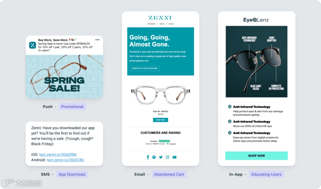 智能发送时间优化能识别用户黄金活跃窗口。推送需与应用内消息、邮件等渠道联动:推送争取外部注意力,应用内消息兑现承诺,邮件承载深度培育。Zenni Optical案例体现价值: