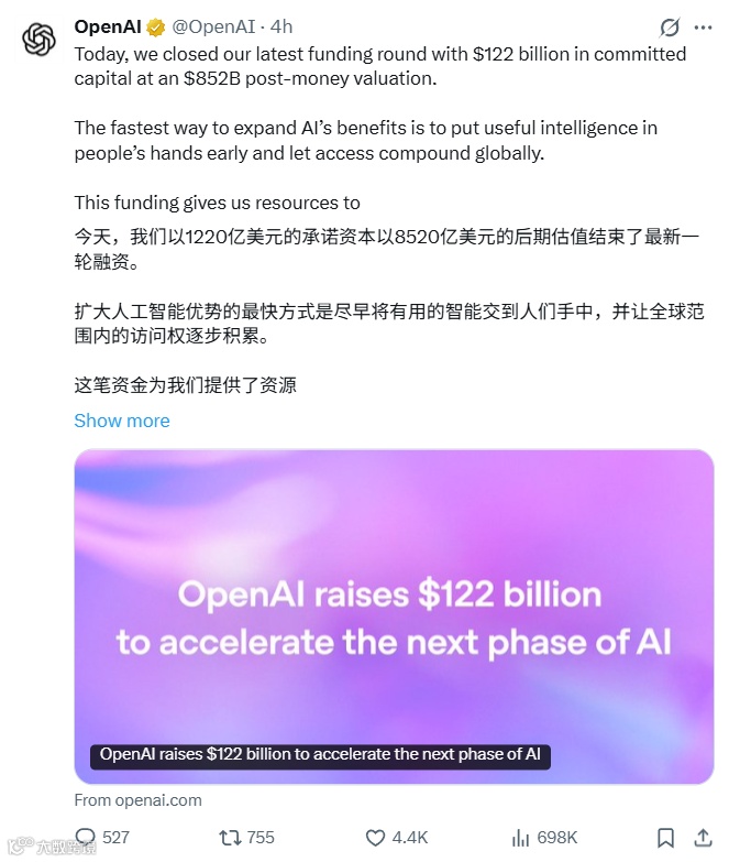 OpenAI完成1220亿美元创纪录融资 估值达8520亿美元