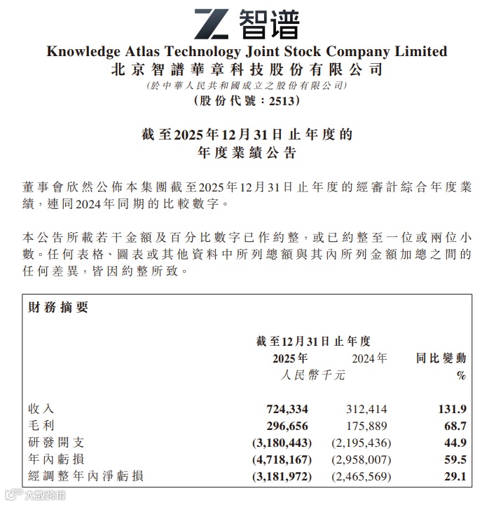 智谱公告显示,2025年收入7.24亿元,净亏损47.18亿元,较上年29.58亿元净亏损进一步扩大。