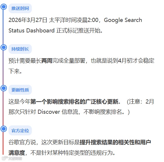谷歌每年实施数次“广泛核心更新”,相当于对全球搜索排名重新洗牌。2026年首轮更新定于3月27日启动。