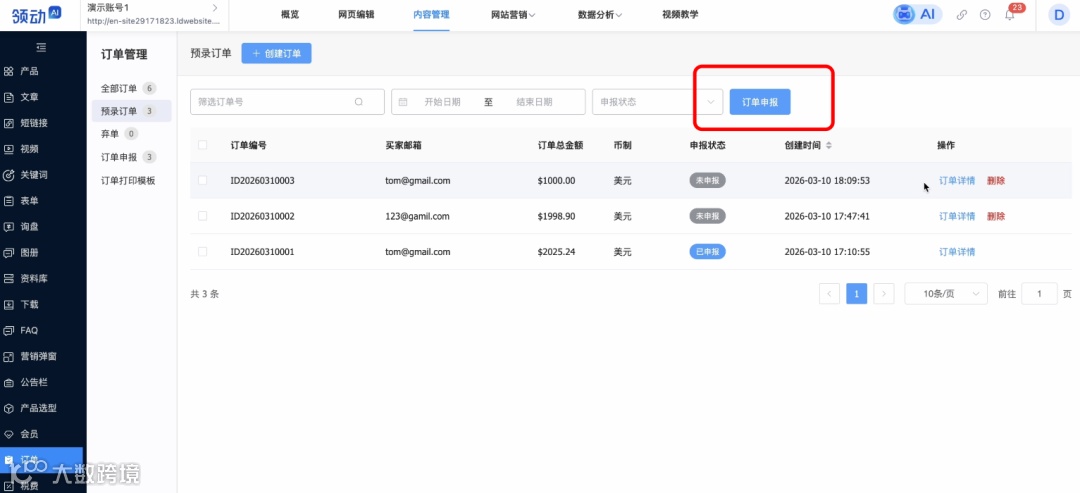 勾选待申报订单,点击「订单申报」按钮提交海关。