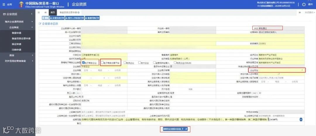 勾选"跨境电子商务企业类型"中的"电子商务企业"、"电子商务交易平台"、"企业网站",点击"保存企业基本信息,下一步";