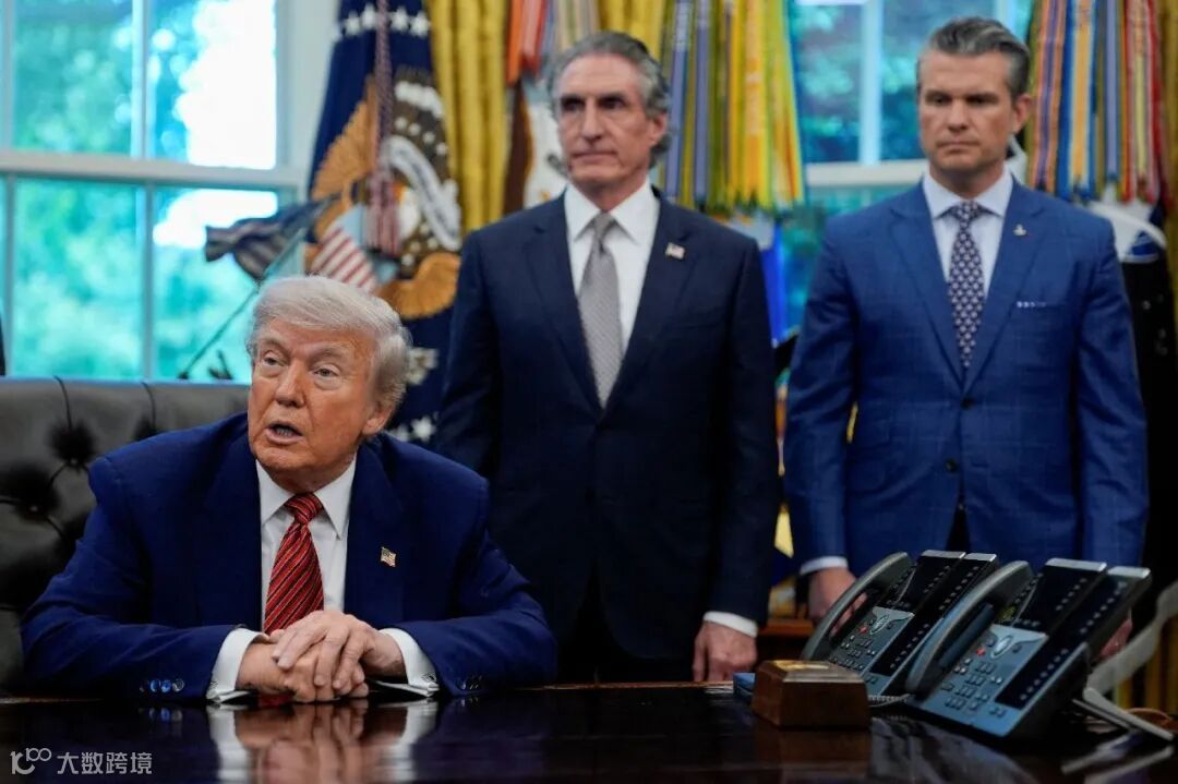 2025年5月23日,特朗普总统在白宫签署一项行政命令并发表讲话。国防部长皮特·赫格塞思和内政部长道格·伯格姆在一旁注视。 (图片来源:路透社)