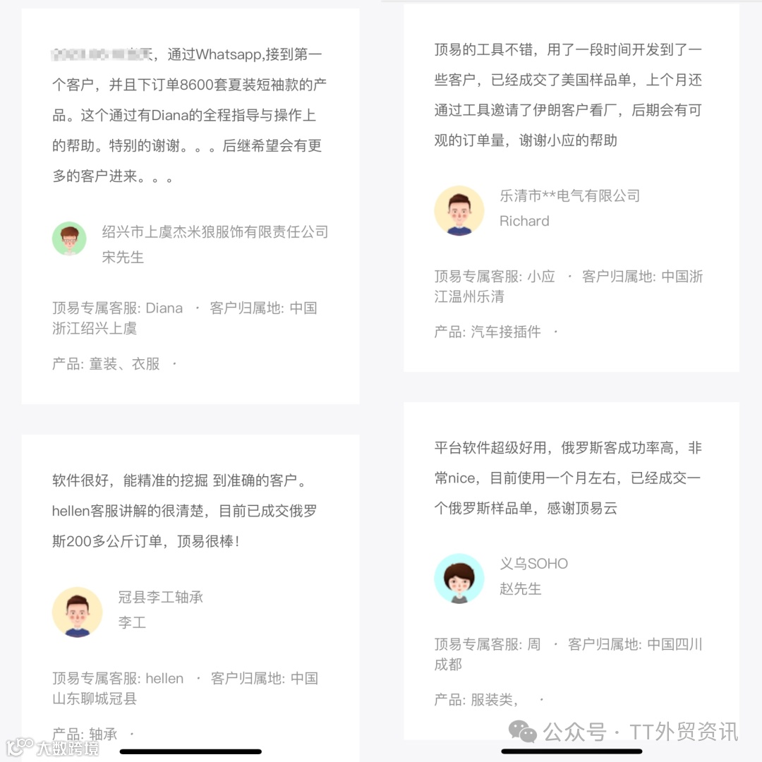 确实不错,使用了这个数据,不到一个月的时间就成了一个东南亚客户的样品单,会继续使用,后期如果有其他信息再来反馈!谢谢!也特别谢谢顶易客服summer!