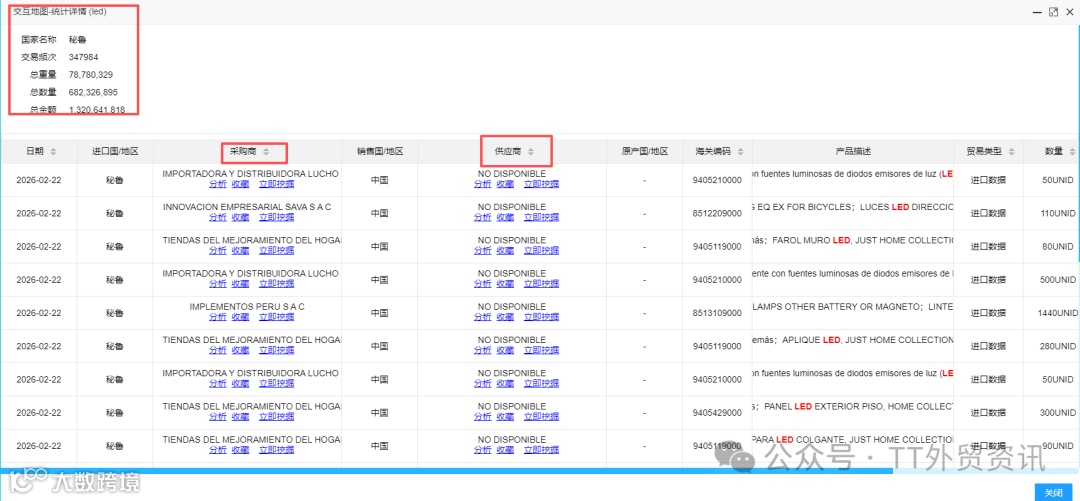 3、查看买家完整进口记录,包括产品描述、进货日期、数量、重量、金额等详细交易信息。