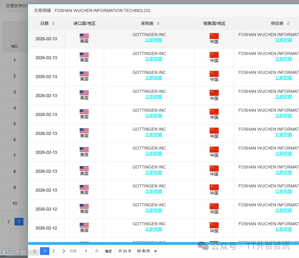 可查询最新交易记录,包括采购商、供应商、商品描述、交易金额、货物数量等关键信息。