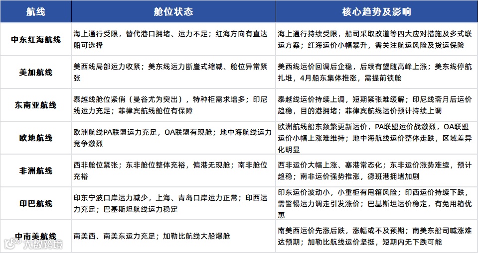 缺乏大宗货盘支撑,运价持续下跌,月初加班船加剧竞争;需警惕中东局势导致运力调往中东,引发缩舱涨价。