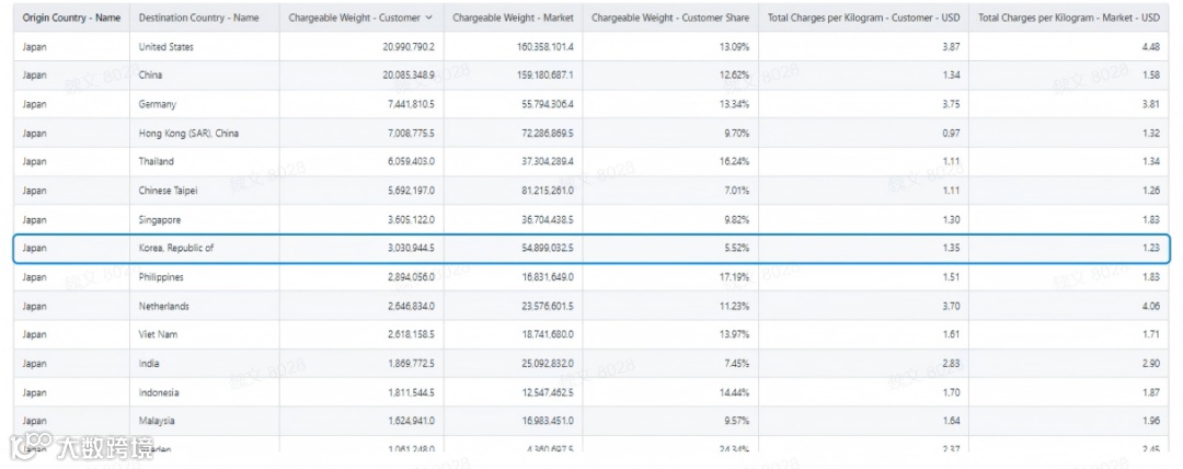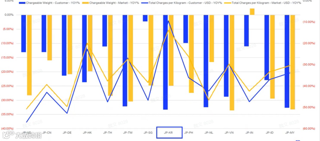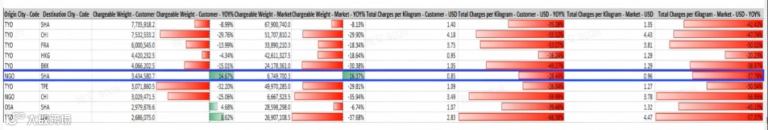 企业调取了2023年从日本始发至前15大贸易目的地的年度数据,将自身货量、市场份额、采购价格与市场平均水平进行对比: