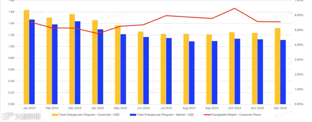三个月后,企业3000-5000kg级别的货量占比从22.8%提升至31%,平均采购成本进一步降至0.88美元/公斤,巩固了成本优势。