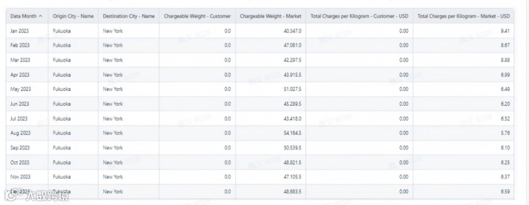 数据显示,福冈-纽约航线全年货量稳定在4-5.4万公斤/月,无明显淡旺季,运价虽年初较高但随后回落至6-7美元/公斤区间,属于健康稳定的市场,值得投入资源拓展。