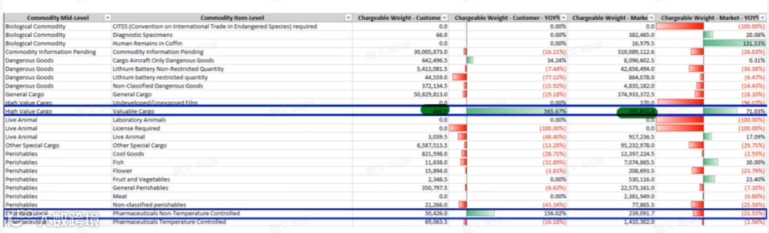 企业进一步利用CargoIS的“商品小项细分”功能,对高价值货物和医药进行下探分析: