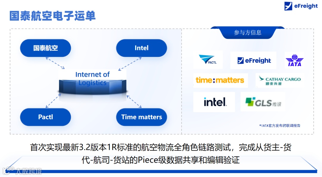 国泰航空联合多方完成 3.2 版本全角色链路测试,实现货主 — 货代 — 航司 — 货站 Piece 级数据共享。