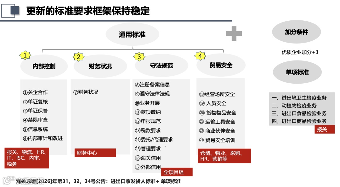 新标准结果导向非常明显,硬指标更多(财务指标、守法指标、查获指标、信用指标、外部优质企业加分等若干核心指标筛选),这样可以扭转前几年抠字眼不断堆砌文件审核风向,标准中植入非常多硬条件,申请或持续维护高级认证对企业或人员的“合规”要求更高。其实这样对进出口从业人员提出了非常高的要求,如果人员不稳定,公司无法获得强力支持,其实高级认证申请一定是受罪的,会时不时受到风险提醒,还不如老老实实呆在常规企业更利。