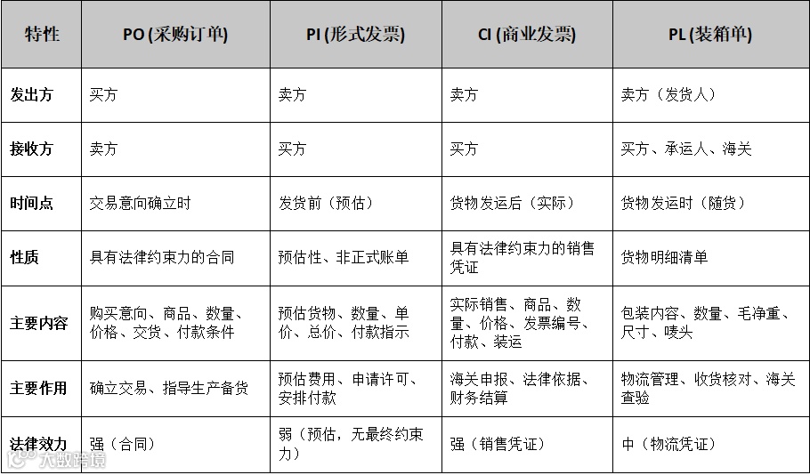在国际贸易与国内商业往来中,各种单据扮演着至关重要的角色。它们不仅是交易过程的记录,更是法律约束、物流协调和财务结算的依据。然而,对于初入贸易领域的人来说,PO(采购订单)、PI(形式发票)、CI(商业发票)和PL(装箱单)这些概念常常令人混淆。