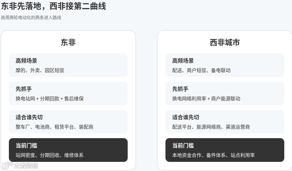 如果你手里更强的是电池、换电系统和站点运营,东非可以先做,西非则更适合从加纳这类先抓审批和能源入口的市场切。