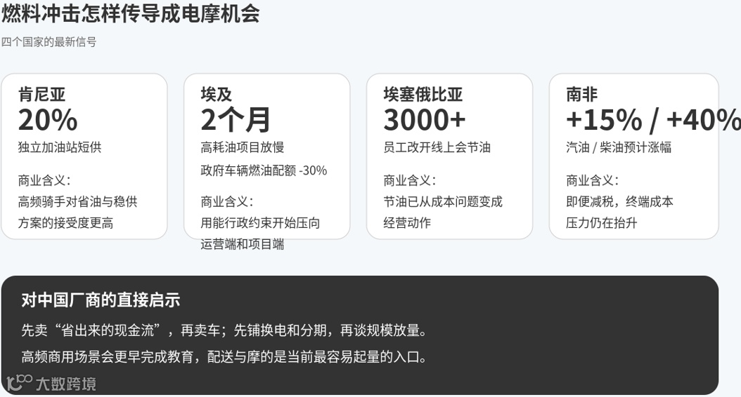 你如果这几天正在看非洲两轮车、配送、换电或本地装配项目,先把判断摆出来:商用两轮电动化的窗口已经开了。这轮窗口不是靠概念撑起来的,油价和供给冲击已经压到了骑手、配送和车队的日常成本。文末给你一个进入判断框架,帮你判断该先去东非,还是先从西非试点。