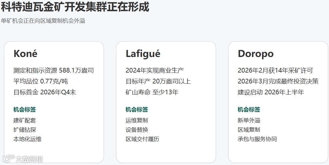 Lafigué已在2024年实现商业生产,目标是年产20万盎司以上并覆盖至少13年。Doropo在2026年2月拿到14年采矿许可,3月完成最终投资决策,建设在2026年上半年启动,首金指向2028年。项目连续落地,意味着承包商、设备商、采矿服务商和地勘队伍更容易从单矿切到区域复制。
