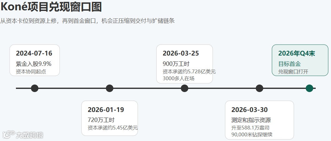 施工节奏更说明问题。1月19日,公司披露Koné累计施工工时超过720万小时,已承诺资本约5.45亿美元,占前期资本开支63%,并维持四季度末首金。到3月25日,这组数字又推进到900万小时和5.728亿美元。工时、资本承诺额、首金节点三条线同时往前走,说明这个项目已经从可研叙事切到交付叙事。