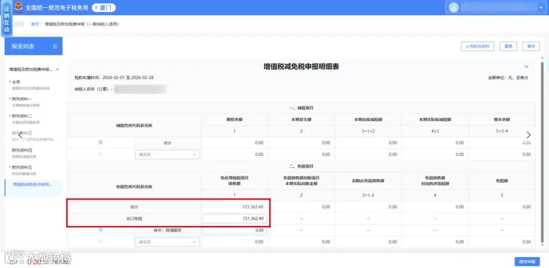 - 填报《增值税减免税申报明细表》"二、免税项目:出口免税"栏目。