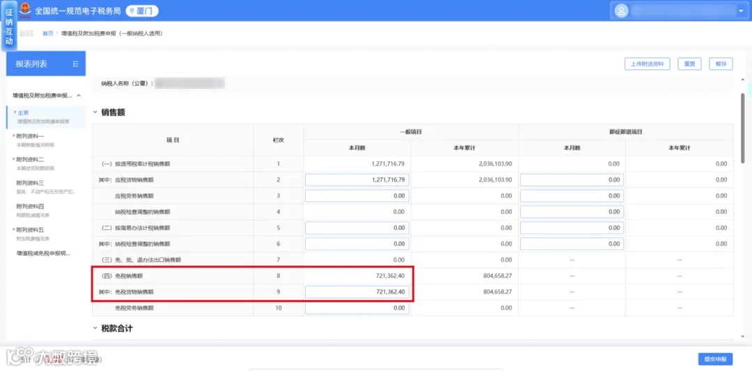 - 同步填报主表《增值税及附加税费申报表》第8-9栏"免税货物销售额";