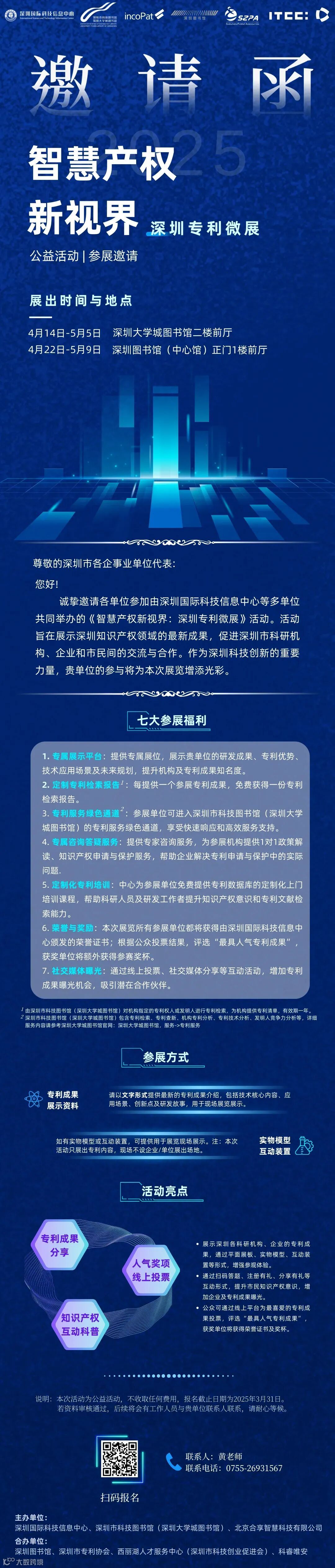 本次展览为公益活动,不收取任何费用,报名截止日期为2025年3月31日。欢迎各企事业单位积极参与,共同推动深圳知识产权事业的发展。