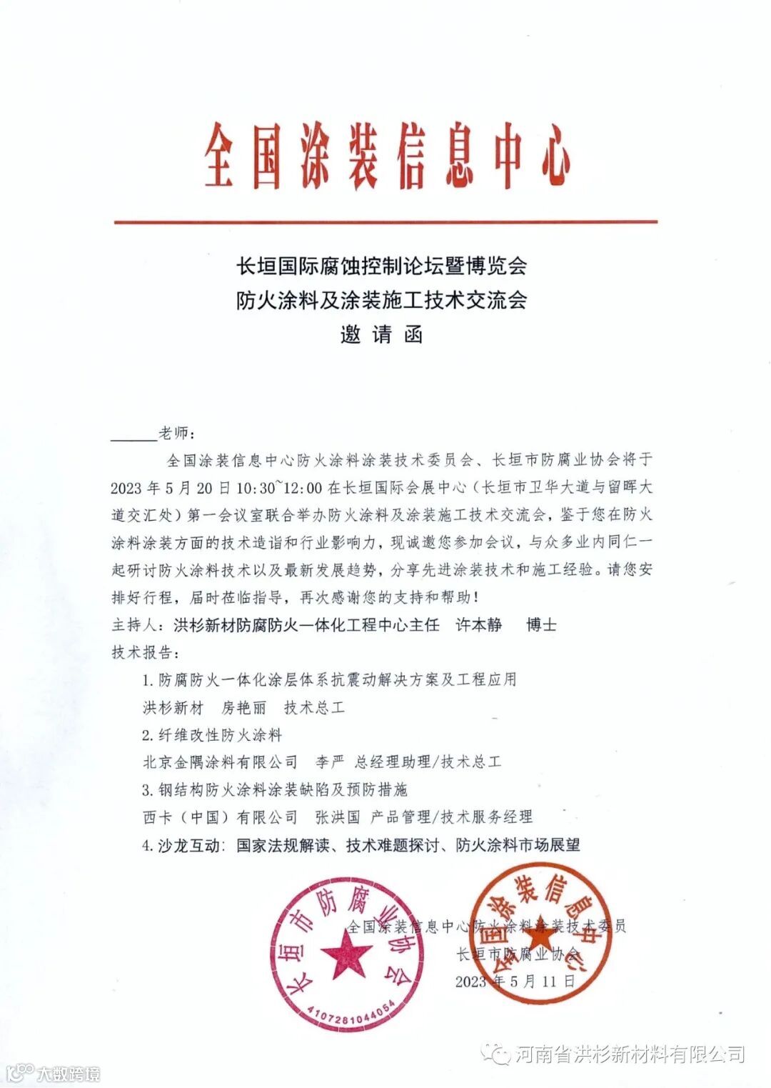 全国涂装信息中心防火涂料技术委员会、长垣市防腐业协会将于2023年5月20日10:30~12:00在长垣国际会展中心举办防火涂料及涂装施工技术交流会。与众多业内同仁一起研讨防火涂料技术以及最新发展趋势,分享先进涂装技术和施工经验。