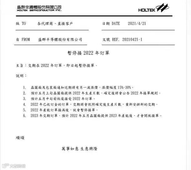 在今年4月下旬时,盛群曾向客户发出涨价函,通知称因为晶圆厂和包装厂有新一波涨价,产品将涨价15%到30%。另外因为晶圆代工厂要在5月上旬才能提供下一年度的生产片数,盛群将暂停接单,在获悉产能和成本后,才会恢复接受2022年订单。