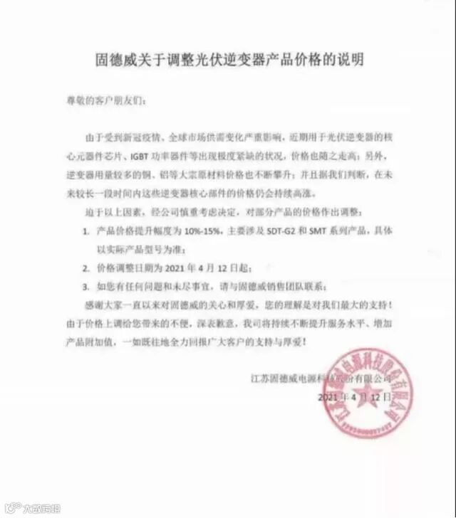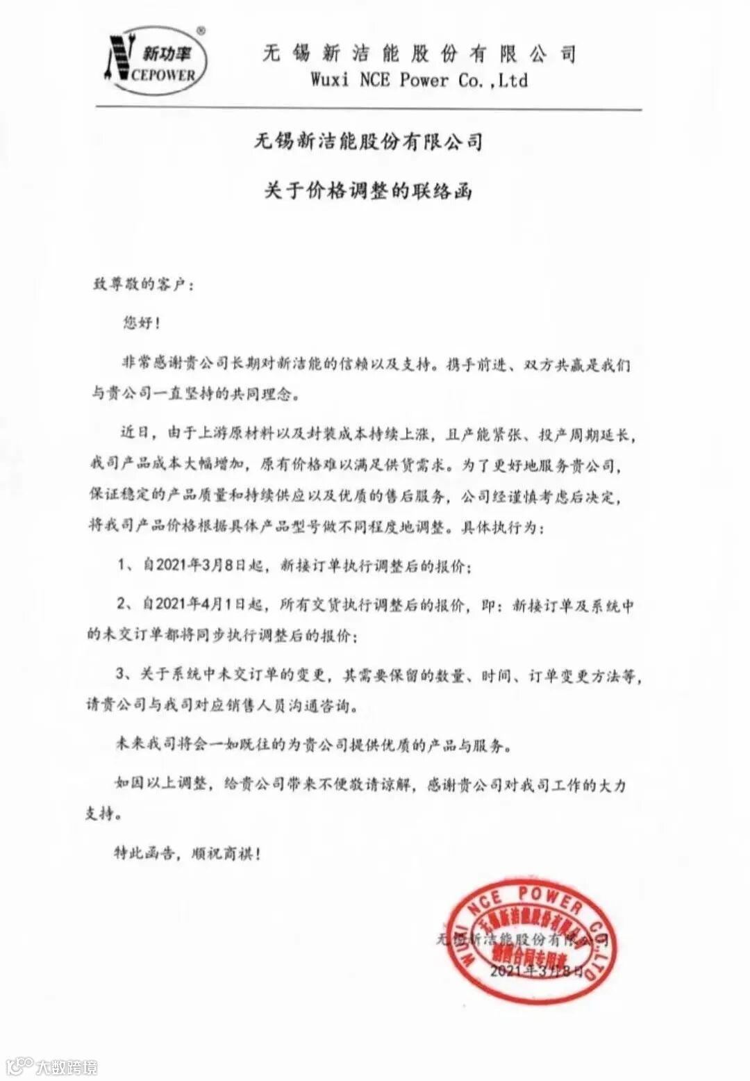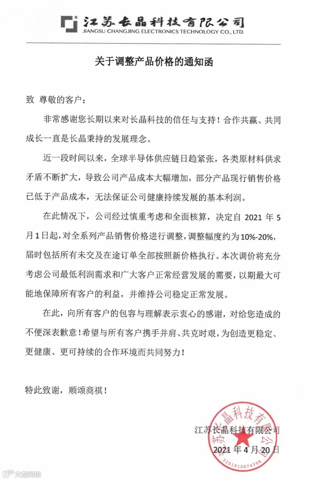 4月20日,长晶科技发布了一份涨价函,宣布自2021年5月1日起,对全系列产品销售价格进行调整,调整幅度为10%-20%。届时包括所有未交及在途订单全部按照新价格执行。