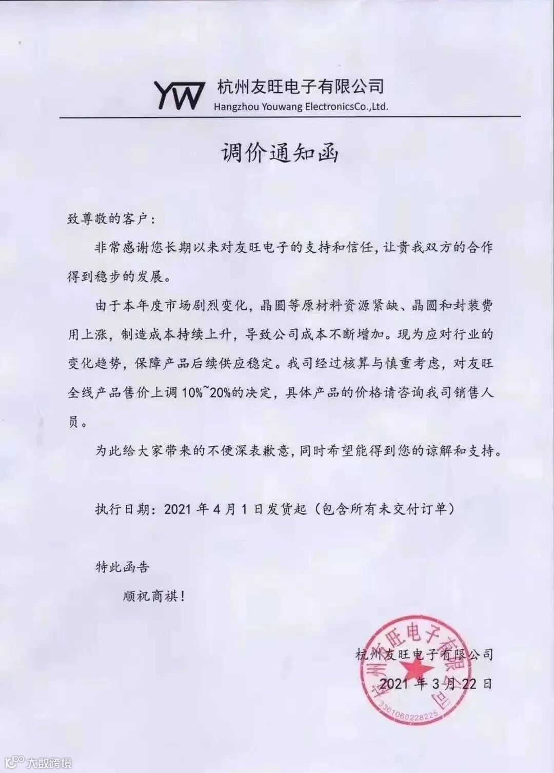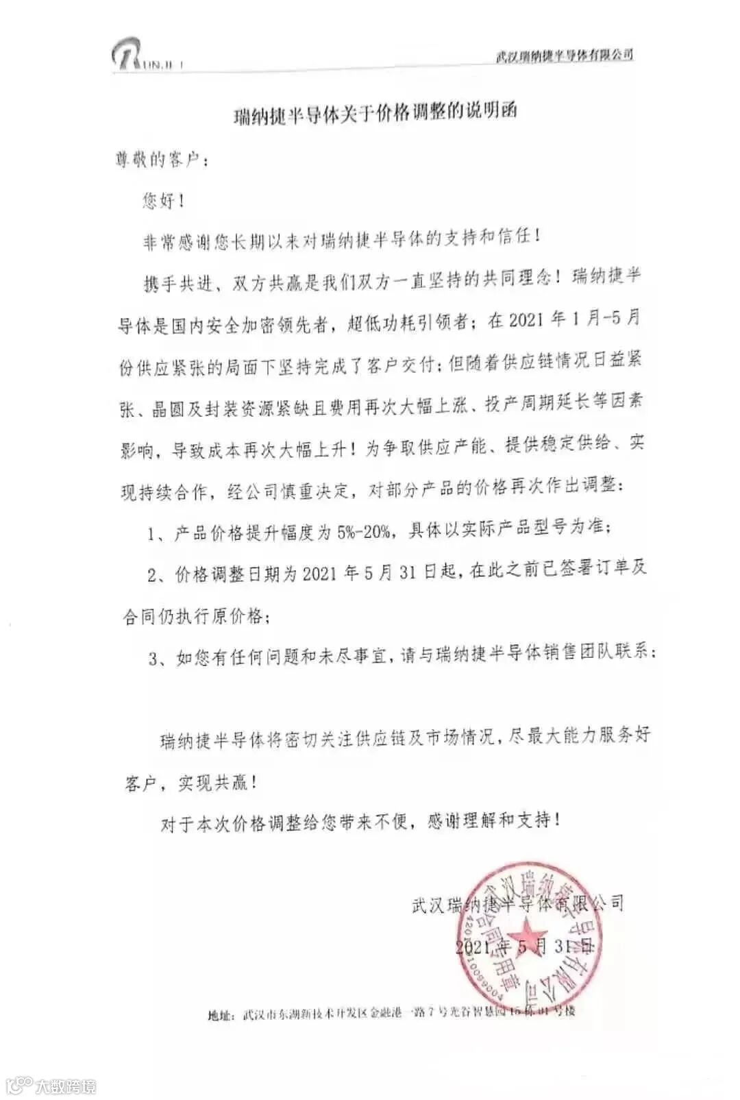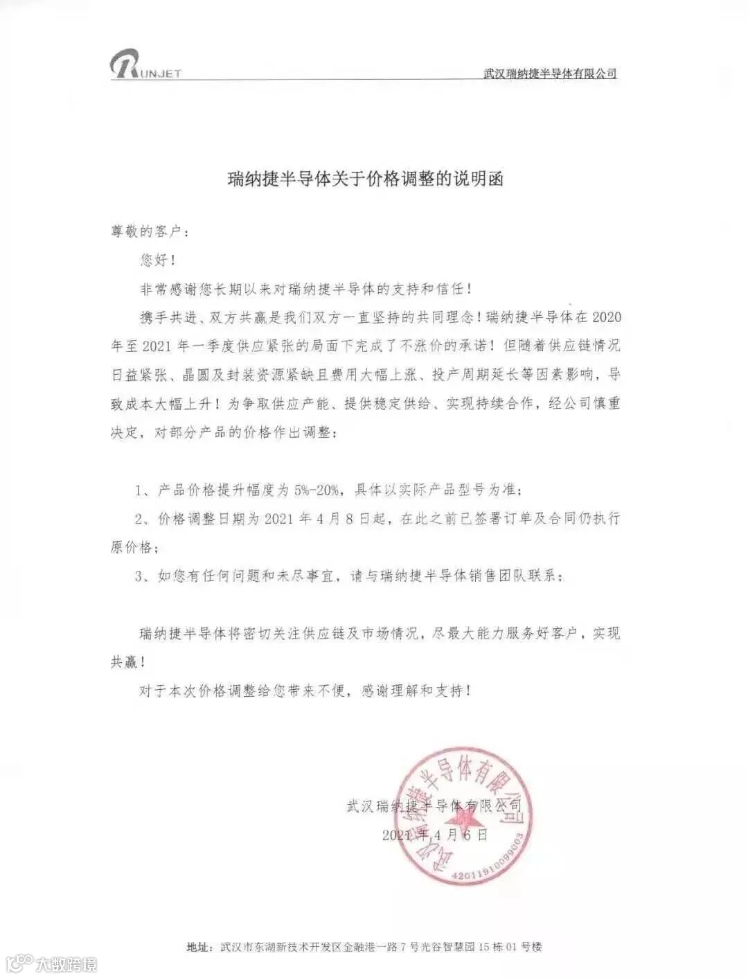 据了解,4月7日,武汉瑞纳捷半导体有限公司就发过一次涨价函,宣布产品价格提升幅度为5%-20%,调整日期为2021年4月8日起。