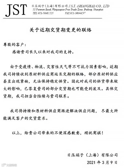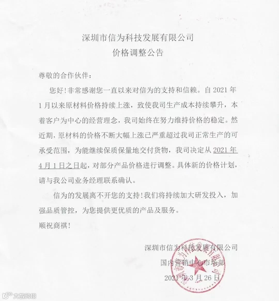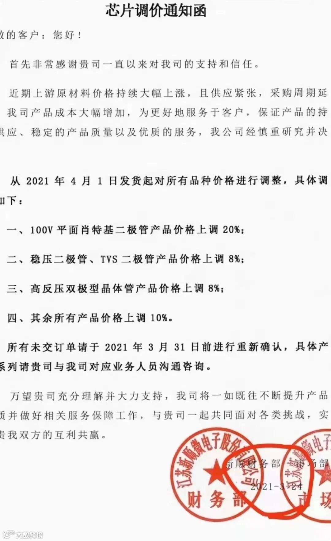 据了解,4月7日,武汉瑞纳捷半导体有限公司就发过一次涨价函,宣布产品价格提升幅度为5%-20%,调整日期为2021年4月8日起。