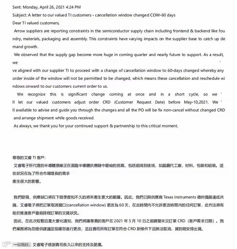 29日,TI唯理商艾睿发布了一则通知,表示窗口期延长为60天。